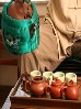 The tea pots are much smaller than typically found in the West, holding just 1-2 cups, or 8 ounces of liquid. Since the clay absorbs some of the tea's essence, different pots are used for different types of tea. The tea pots and cups sit on a special slatted bamboo box to drain and hold the excess liquid that is poured over the tea pots.